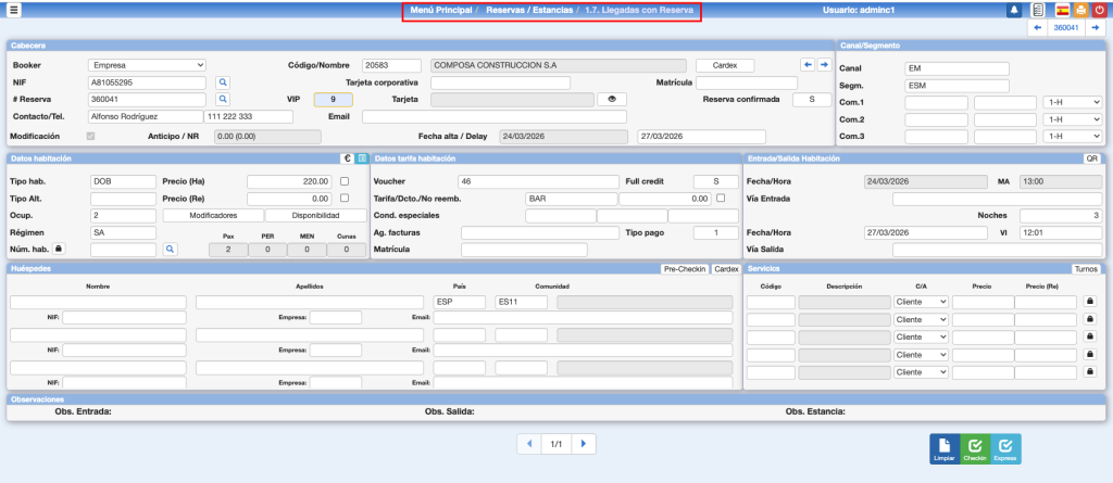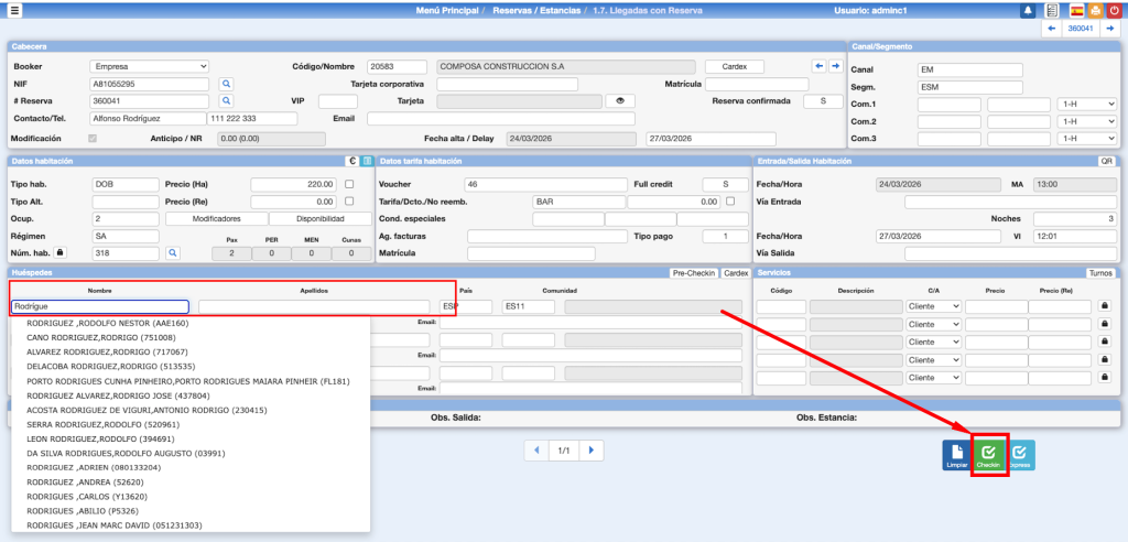 Este es el listado de reservas con entrada en la fecha activa (hoy). Haciendo doble clic en cualquiera de ellas se accede al checkin de la misma.