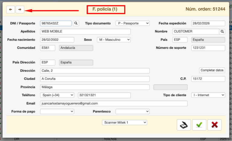 Posteriormente, pulsando el botón Checkin se muestra el popup para introducir los datos para la Ficha de Policía.