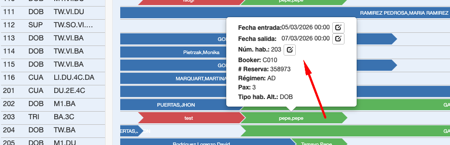 Pulsando sobre cualquier bloque de Reservas (verde), es posible cambiar las fechas de entrada y salida así como el número de habitación preasignado, siempre dentro del tipo de habitación que tenga la reserva.