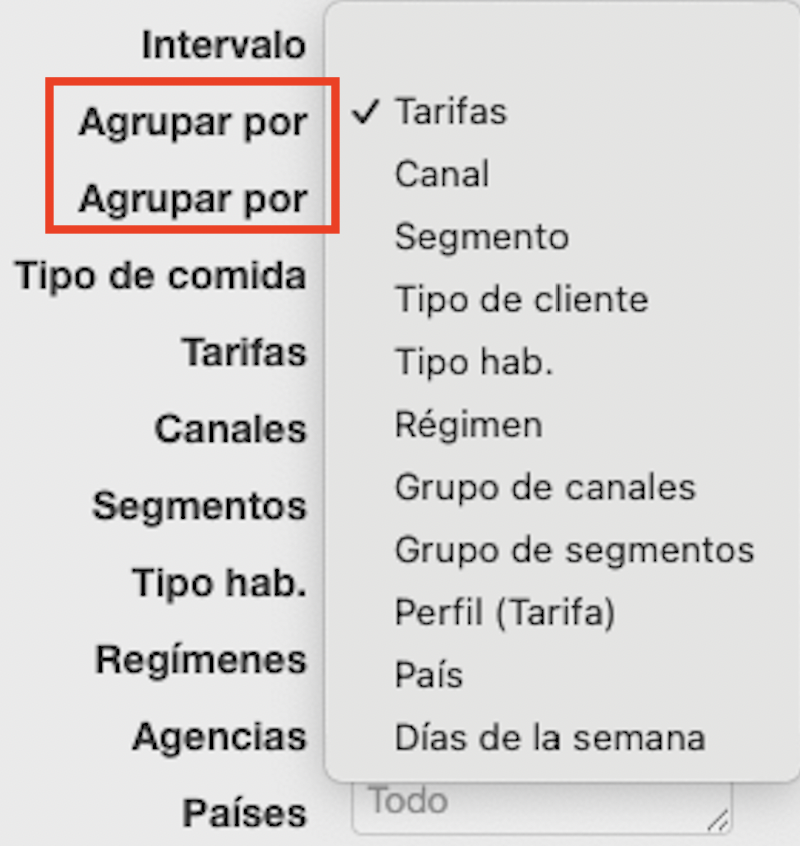 Agrupar por:Permite agrupar los datos en dos agrupadores combinados. (Tarifas, Canal, Segmento, Tipo Cliente, Tipo Habitación, Régimen, Grupo de Canales, Grupo de Segmentos, Perfil Tarifa, País, Días de la semana)