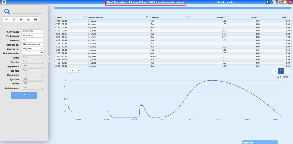Las columnas siguientes no muestran los totales de cada régimen contratado. En el ejemplo de la imagen, vemos que en la primera línea (2023-01-01 dom) tenemos 447 Des 1, 22 Cen 1 (no hay punteos – servidos), 425 DS y 22 MP. En el caso de las cenas vemos que coinciden con la MP. Para los desayunos (Des 1) habría que sumar los regímenes de DS más los de MP, que incluyen desayuno y cena.