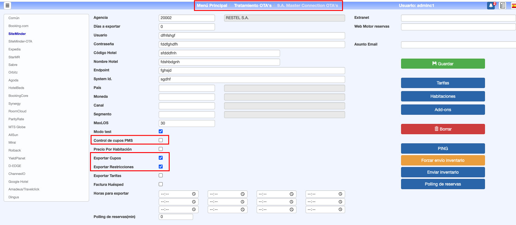 El primer campo configuramos el número de habitaciones que permitimos reservar a la agencia y el segundo campo «Cupo usado» cuenta las habitaciones que se han reservado para la agencia. Por lo tanto, la disponibilidad que tiene la agencia es la diferencia de los dos datos. En caso de que esté marcado el parámetro Control de cupos PMS, el dato que se enviará a la agencia es el menor entre el resultado del cupo (cupo – cupo usado) y la disponibilidad real del tipo de habitación.
