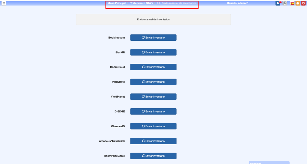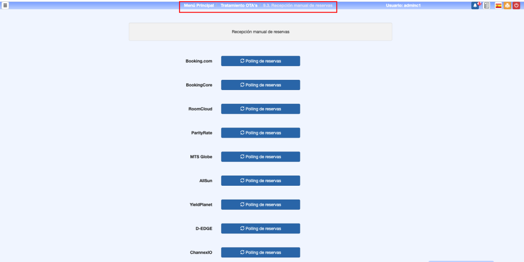 Estas dos en el Tratamiento de OTA’s, 9.2.Envío manual de inventarios y 9.3. Recepción manual de reservas podrá enviar inventario y hacer polling de reservas de forma manual sin tener acceso a la configuración de las OTA’s. Solo se muestran las OTA’s activas.
