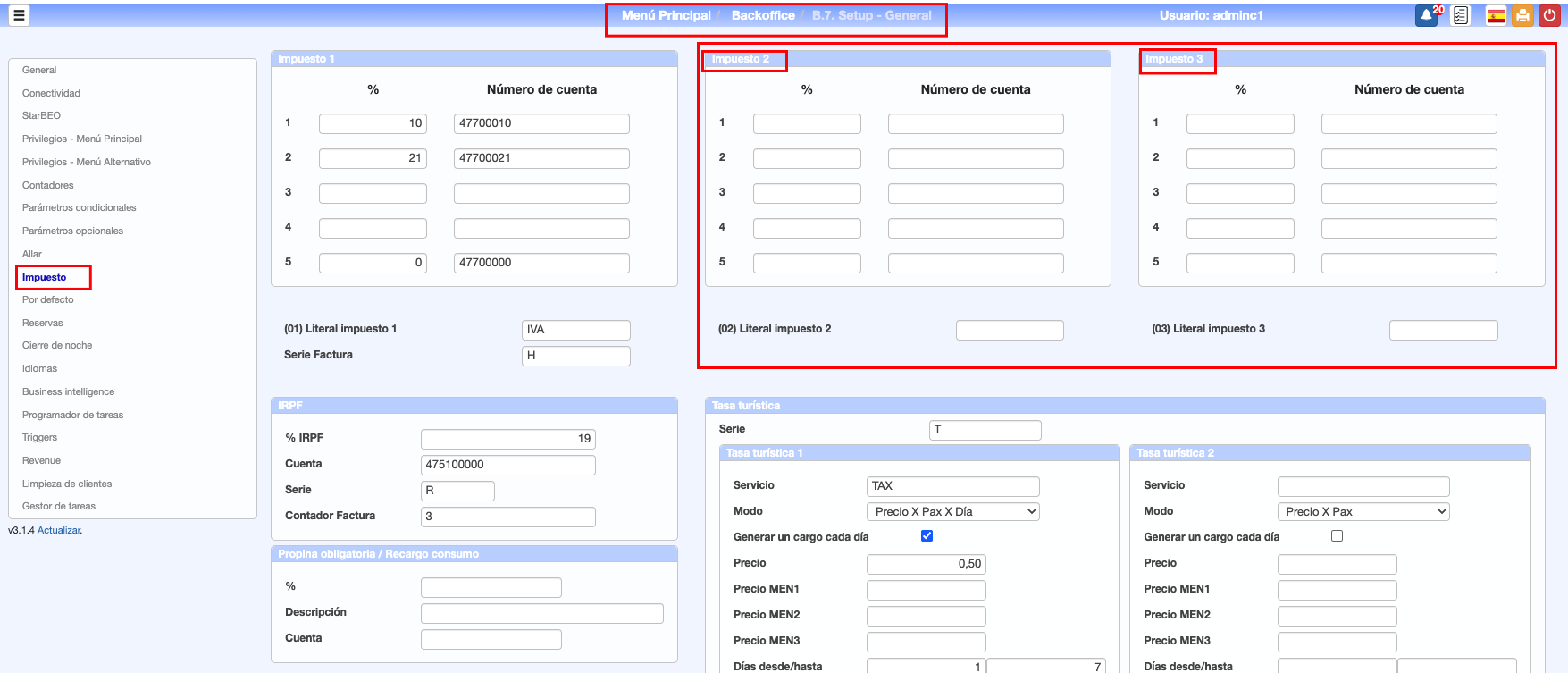 - Nombre del Hotel. Figurará en todas las pantallas. Importante cuando se maneja MULTI-HOTEL.