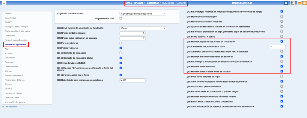 (12) Restar habitaciones bloqueadas en % de ocupación. Se calculará el porcentaje de habitación ignorando o no, las habitaciones bloqueadas. Afecta al cálculo en Calendarios y opciones donde no existe un check para elegir este parámetro.