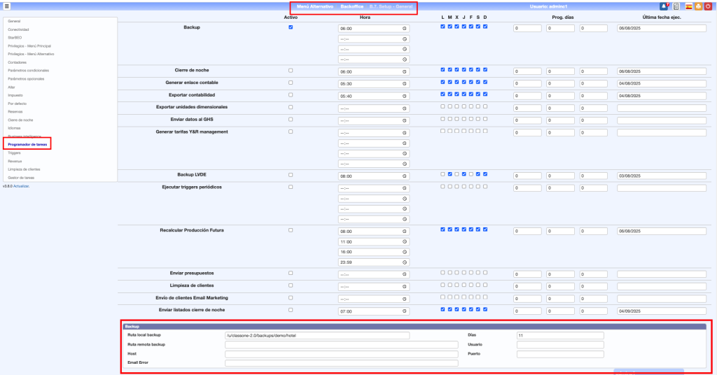 En esta pestaña podemos definir las diferentes programaciones que queramos que se realicen automáticamente, por ejemplo, realizar un backup en una determinada hora y día, que el cierre de noche se haga automático, que nos exporte los datos a contabilidad, etc.