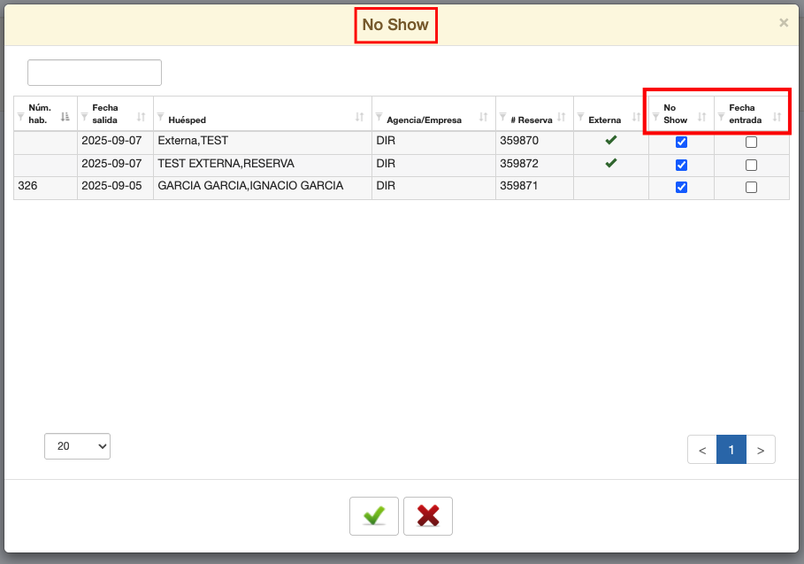 Tras introducir el código, se lanzan los listados de operaciones que quedan pendientes del día: qué hacer con los NO SHOWS (incluyendo las Reservas Externas que estarán marcadas en la columna Externa), Salidas pendientes, etc.