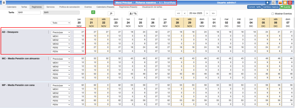 Tenemos la posibilidad de configurar servicios asociados a una tarifa y definir distintos precios por día. Esta configuración repercutirá tanto en el envío de precios a las OTAs y en la descarga de reservas, como desde la Consulta de precios y la carga manual de reservas.