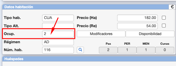Precio por ocupación para cada ocupante estándar del tipo de habitación. En este caso, la ocupación estándar es de «hasta» dos personas. Si se tratase de una habitación triple aparecerían tres casillas, cuádruple con cuatro, etc. El precio lo tomará de la casilla que corresponda a la ocupación definida en la reserva/estancia. Si el campo Precio Habitación tuviera un valor mayor que cero, se sumaría al precio de la ocupación.